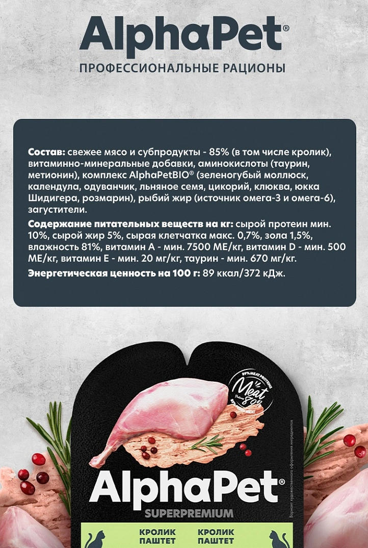 Состав: свежее мясо и субпродукты - 85% (в том числе кролик), витаминно-минеральные добавки, аминокислоты (таурин, метионин), комплекс AlphaPetBIO (зеленогубый моллюск, календула, одуванчик, льняное семя, цикорий, клюква, юкка Шидигера, розмарин), рыбий жир (источник омега-3 и омега-6), загустители.