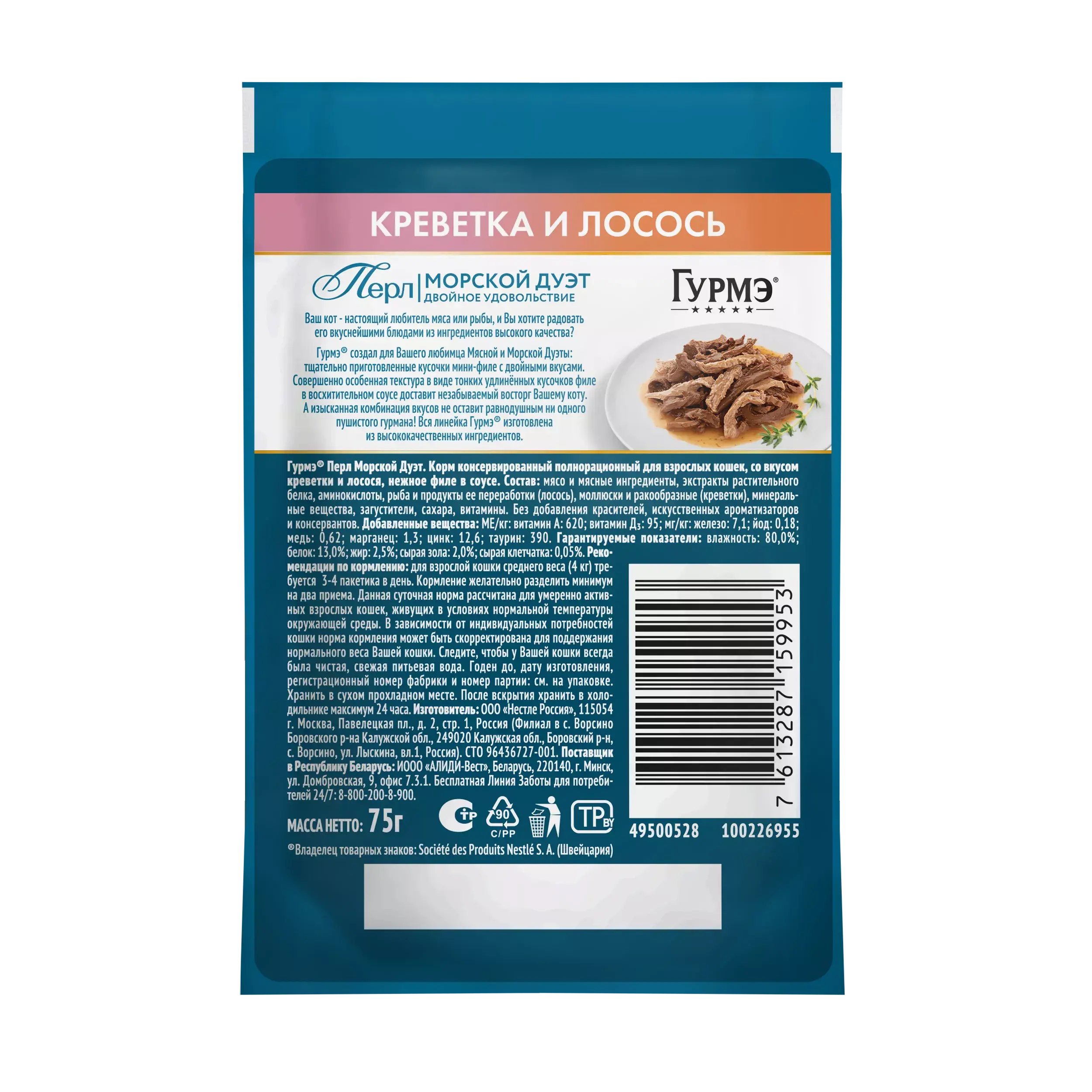 Влажный корм Гурмэ Перл для кошек соус креветка и Лосось (75 гр)