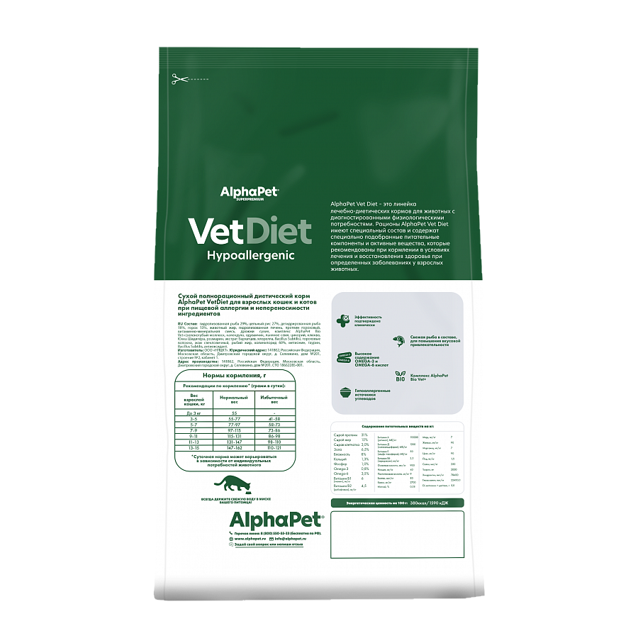 Уценка! Срок 06.08.26/ Сухой диетический корм AlphaPet VetDiet HYPOALERGENIC для взрослых кошек и котов при пищевой аллергии и непереносимости ингредиентов