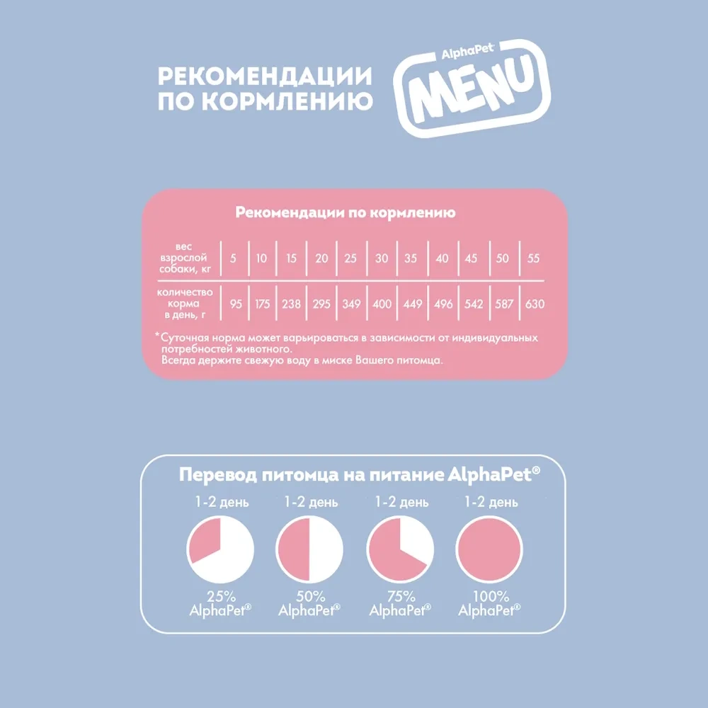 AlphaPet Menu - натуральный сбалансированный рацион со свежем мясом, который точно понравится вашему питомцу! Свежее мясо, а также деликатная термическая обработка позволяет максимально сохранить естественные витамины и минеральные вещества в продукте, что обеспечивает прекрасный вкус и отличную усвояемость рациона.