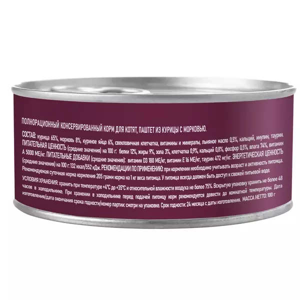 Паштет из курицы с кусочками моркови для котят - это монопротеиновое сбалансированное питание для растущего организма, изготовленное из одного вида мясного белка без содержания зерна и глютена, с добавлением овощей и фруктов богатых витаминами и минералами.