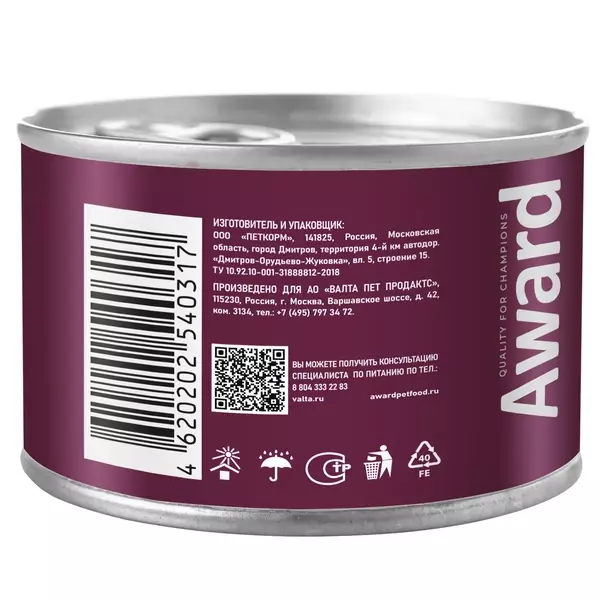 Консервы AWARD для щенков от 1 месяца, паштет из индейки с грушей