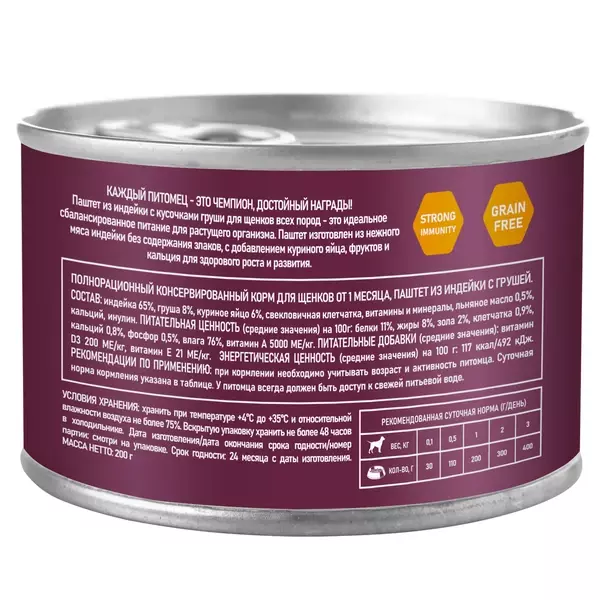 Паштет из индейки с кусочками груши для щенков - это сбалансированное питание для растущего организма, изготовленное из мяса индейки, без содержания зерна и глютена, с добавлением овощей и фруктов богатых витаминами и минералами.