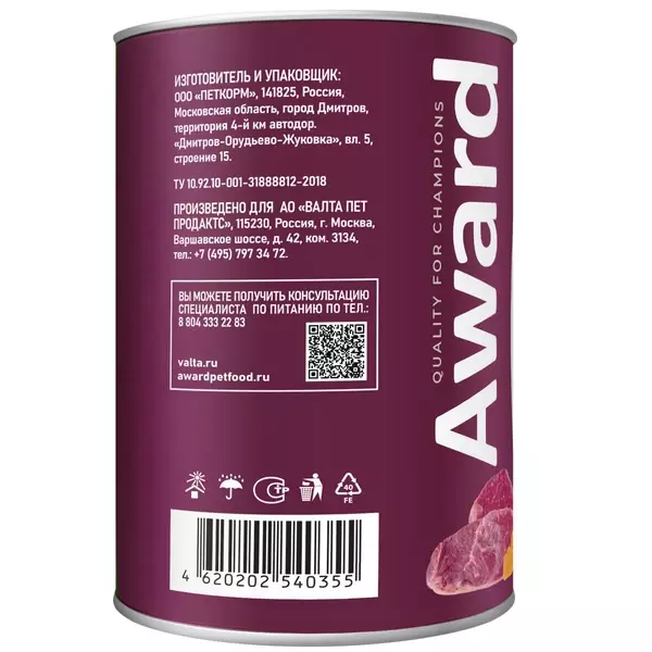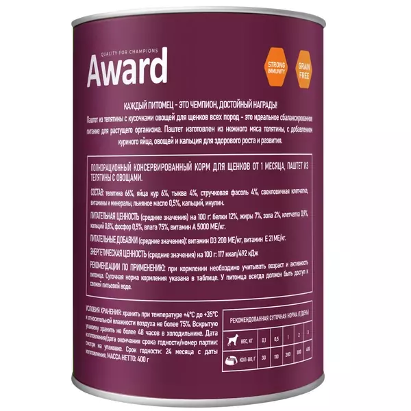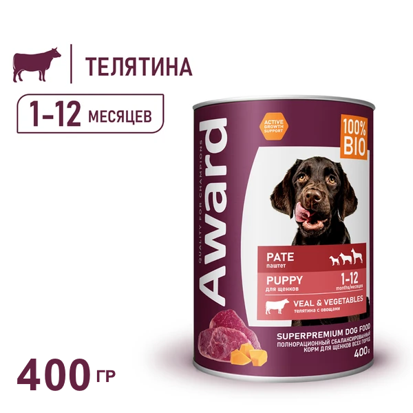 Консервы AWARD для щенков от 1 месяца, паштет из телятины с овощами