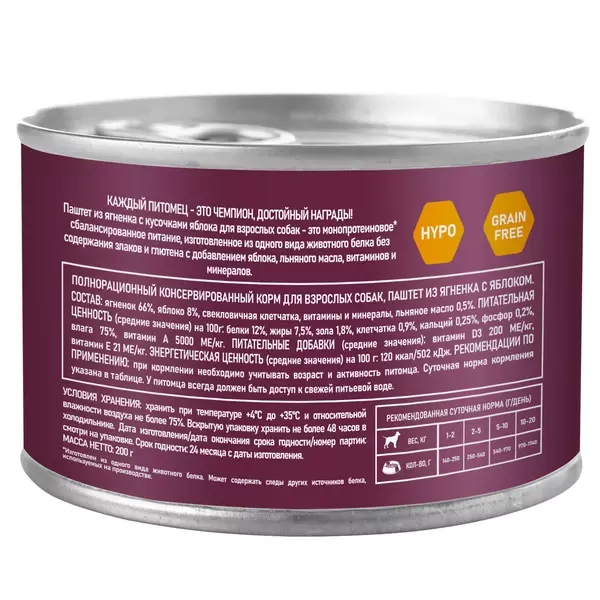 Паштет из ягненка с кусочками яблока для взрослых собак - это монопротеиновое сбалансированное питание для любимого питомца, изготовленное из одного вида мясного белка без содержания зерна и глютена, с добавлением овощей и фруктов богатых витаминами и минералами.