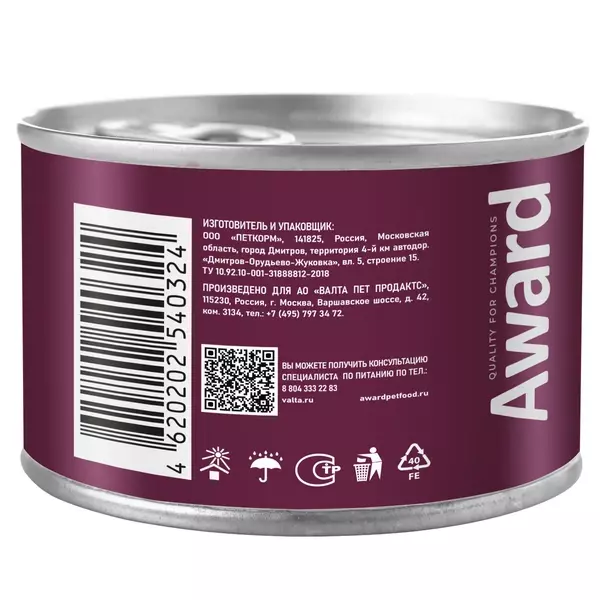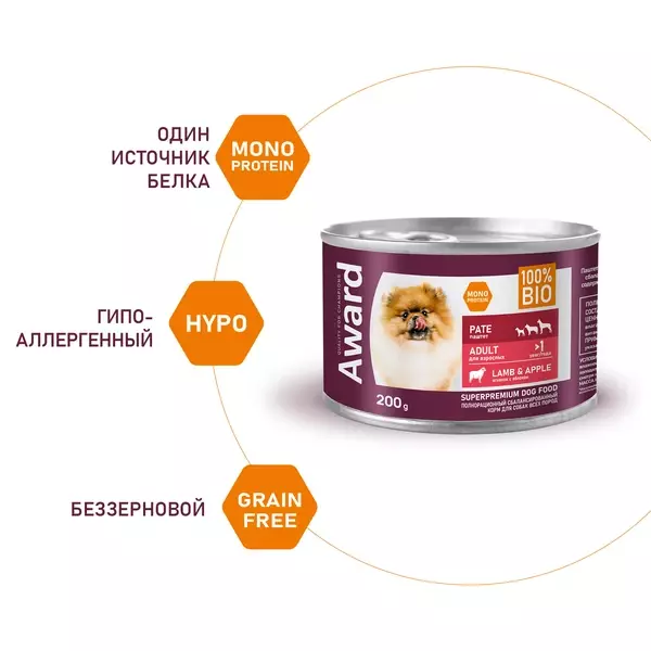 Консервы AWARD для взрослых собак, паштет из ягненка с яблоком