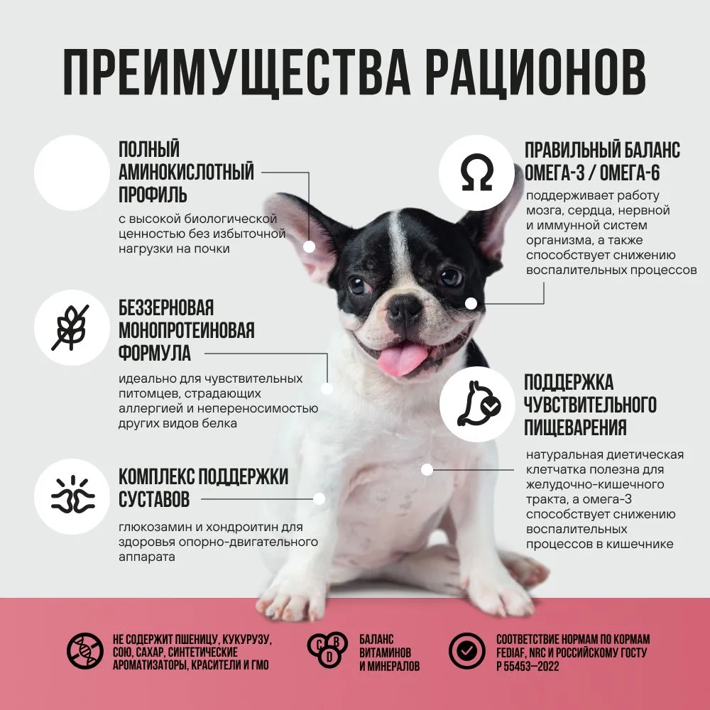 - Соответствует нормам по кормам FEDIAF, AAFCO, NRC и ГОСТу.
