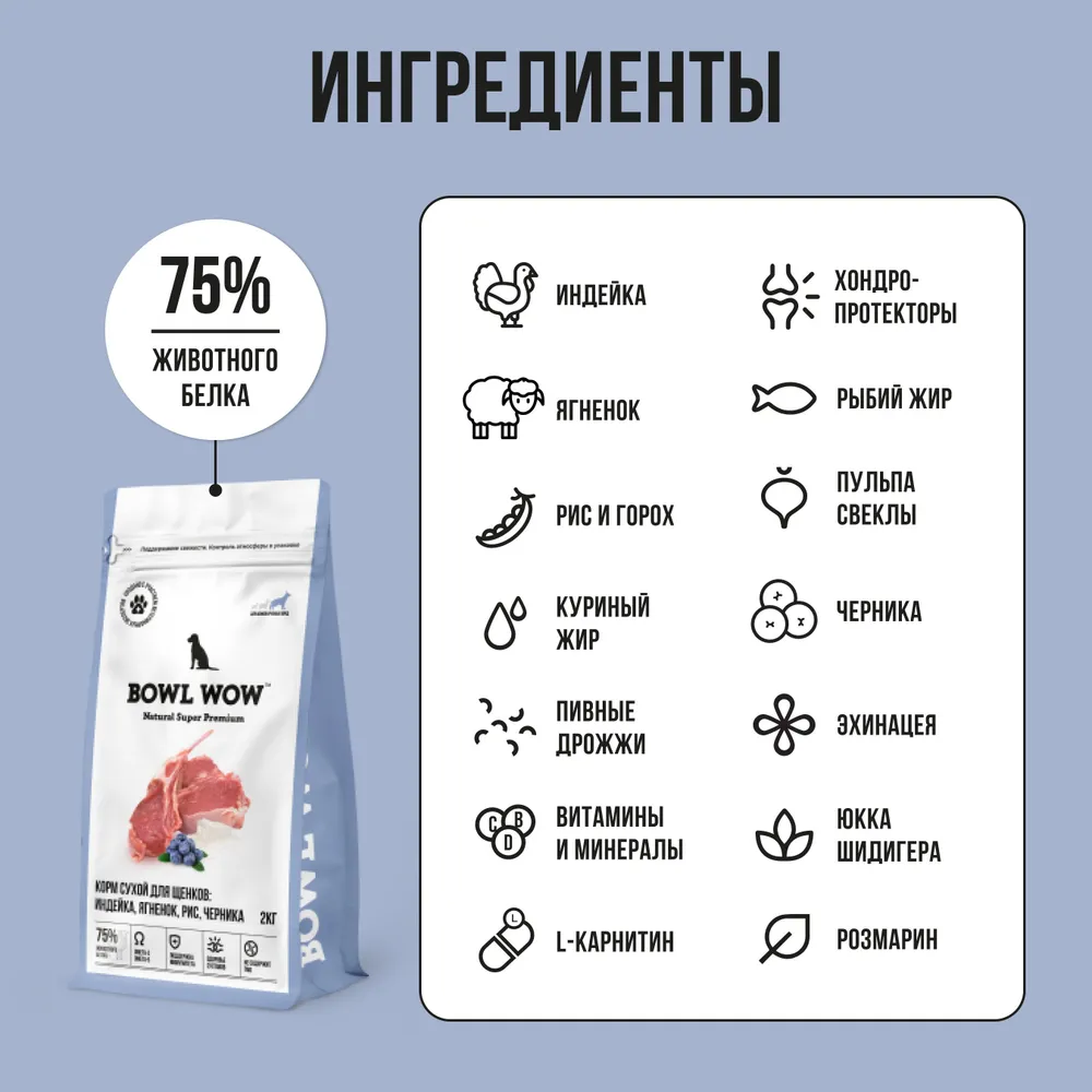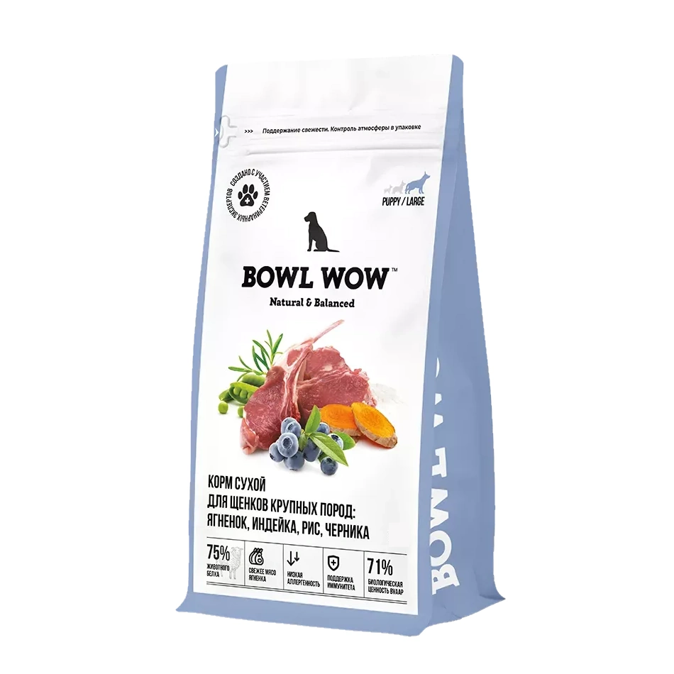 Сухой корм BOWL WOW для щенков крупных пород с ягненком, индейкой, рисом и добавлением черники