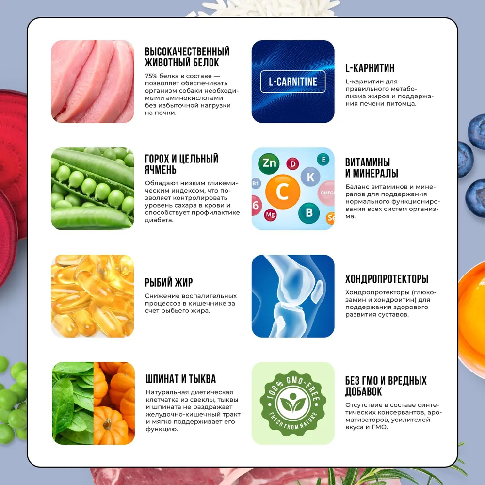 - Мясные и рыбные ингредиенты (индейка, ягненок, рыба, печень) — источники животного белка и незаменимых аминокислот.