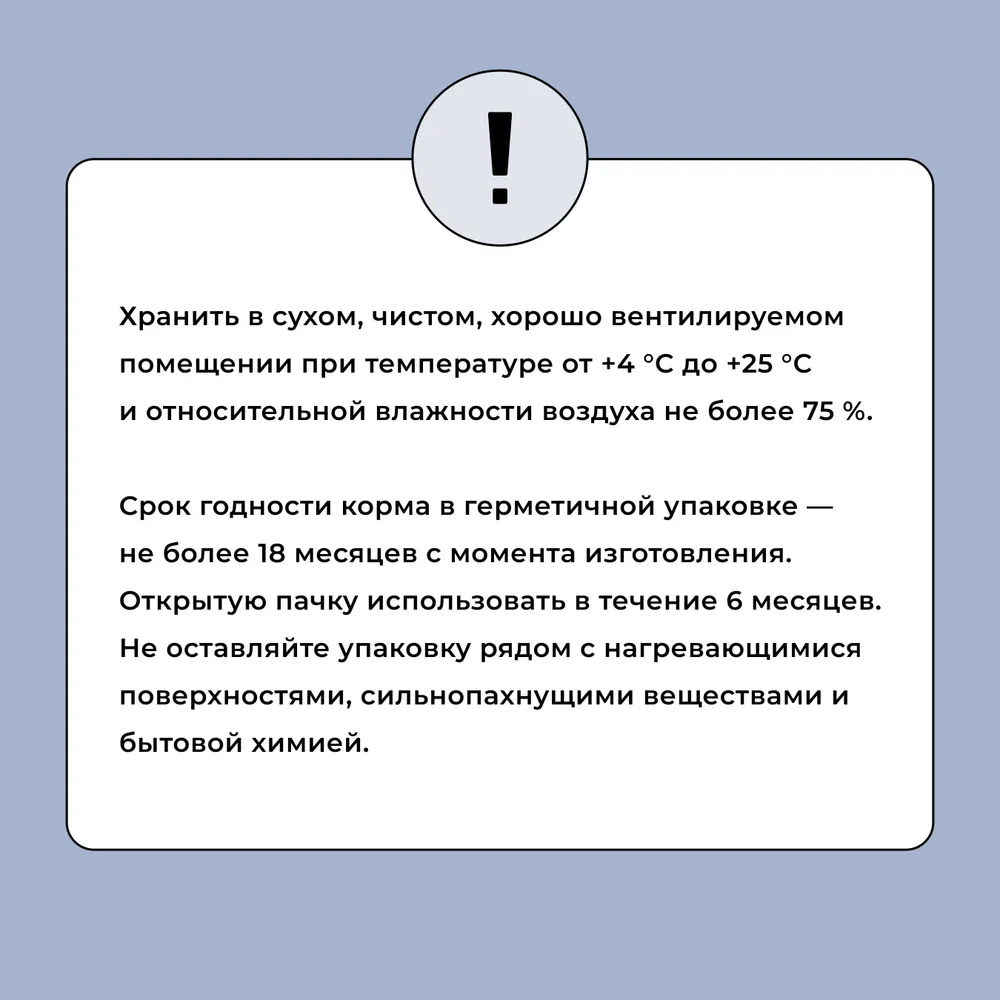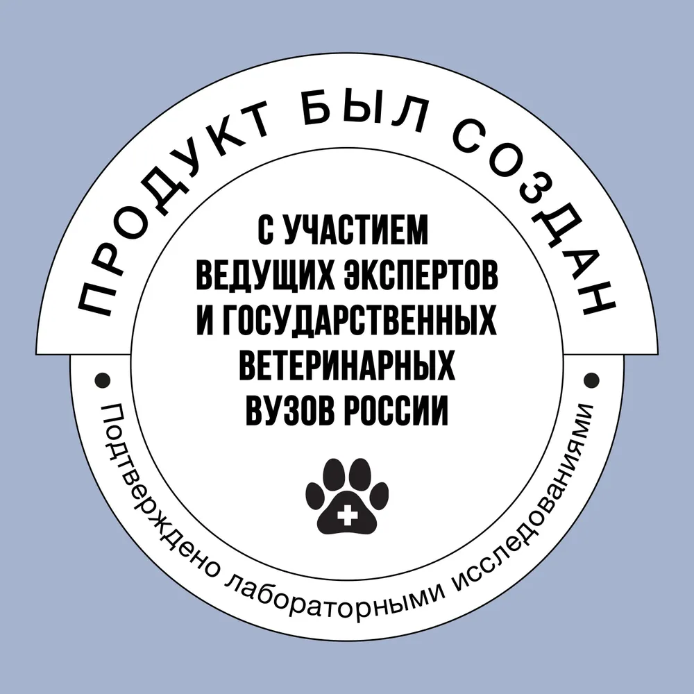 В составе отсутствуют синтетические консерванты, ароматизаторы, усилители вкуса и ГМО. Соответствует нормам по кормам FEDIAF, AAFCO, NRC и ГОСТу.