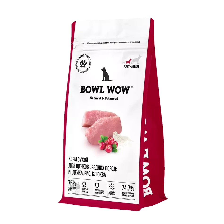 Купить корм BOWL WOW для щенков средних пород с индейкой, рисом и клюквой, сухой полнорационный корм супер-премиум класса | Zoogastronom Самара, Тольятти