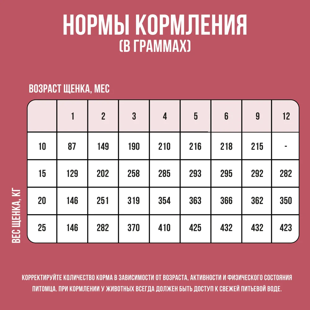 Корректируйте количество корма в зависимости от возраста, активности и физического состояния питомца. При кормлении у животных всегда должен быть доступ к свежей питьевой воде.
