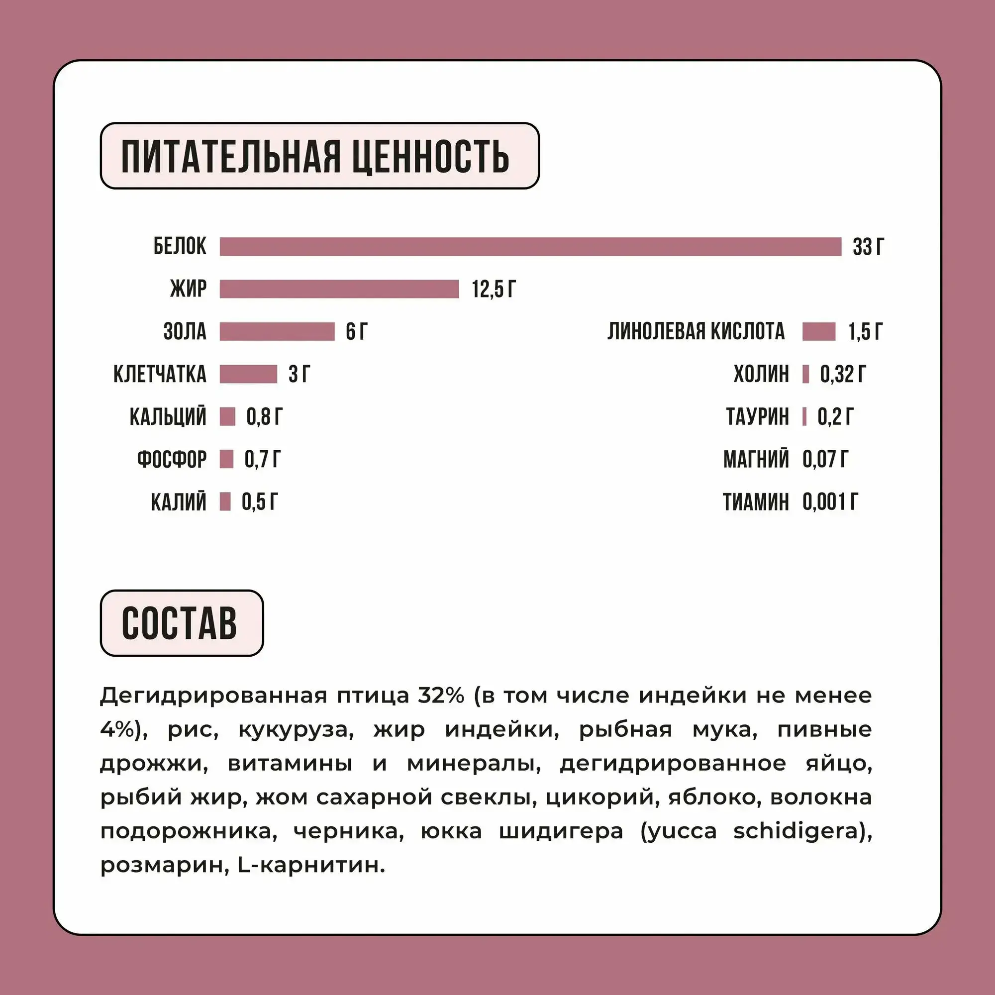 - Соответствует нормам по кормам FEDIAF, NRC и российскому ГОСТу Р 55453-2022.