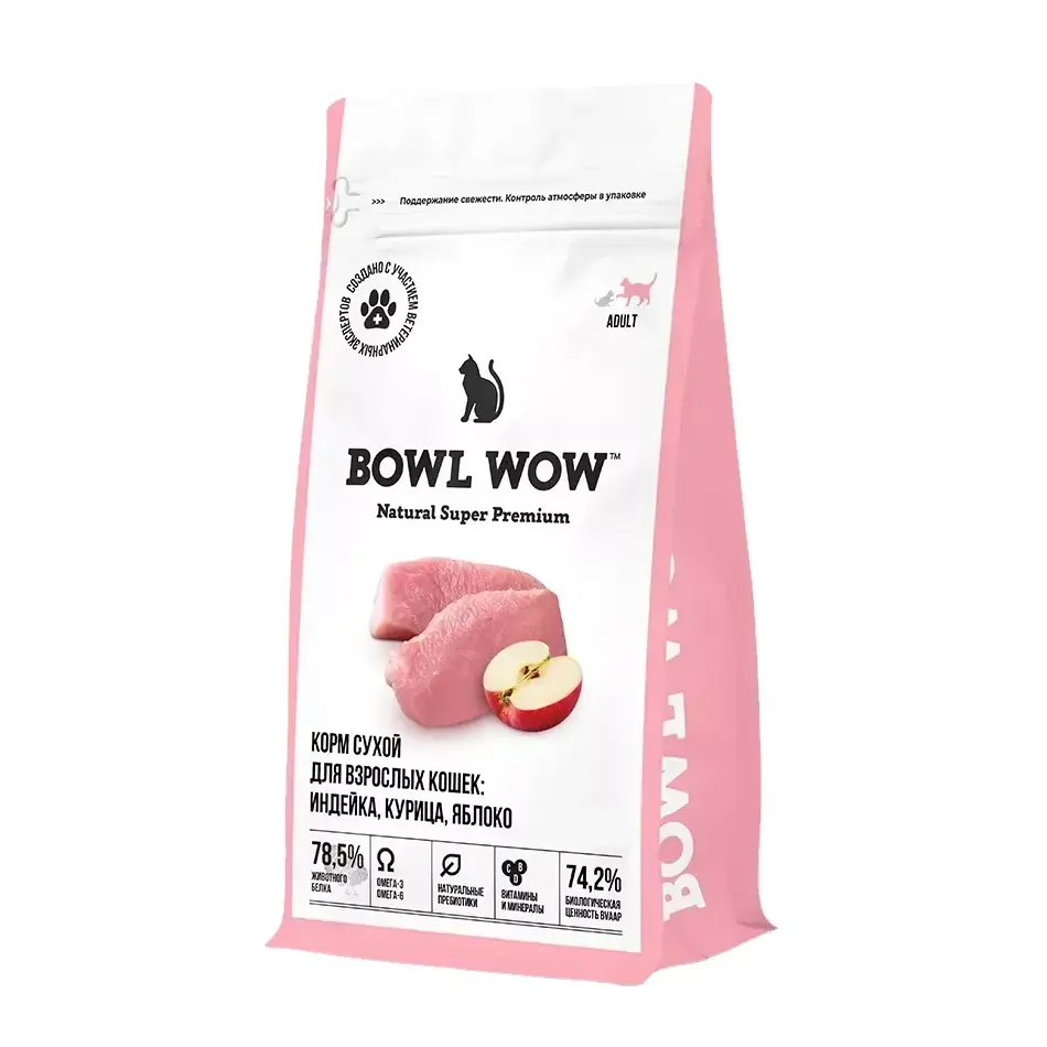 Уценка! Повр.упак./ Сухой корм BOWL WOW для взрослых кошек с индейкой и яблоком