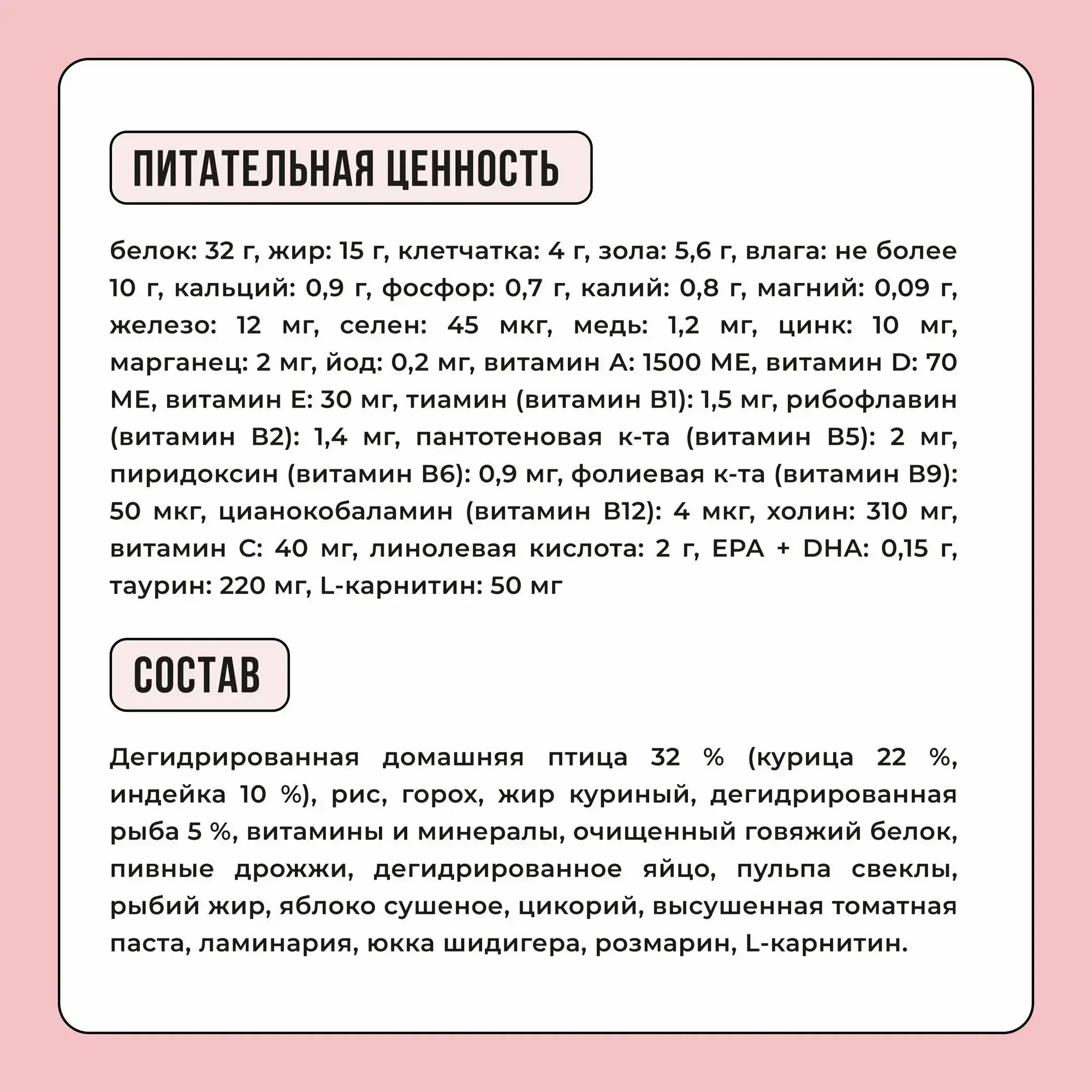 Полнорационный корм с высоким содержанием животного белка — идеальное выражение вашей заботы о своем питомце. Сбалансированная формула из натуральных ингредиентов помогает поддерживать здоровье и активность вашей кошки день за днем.