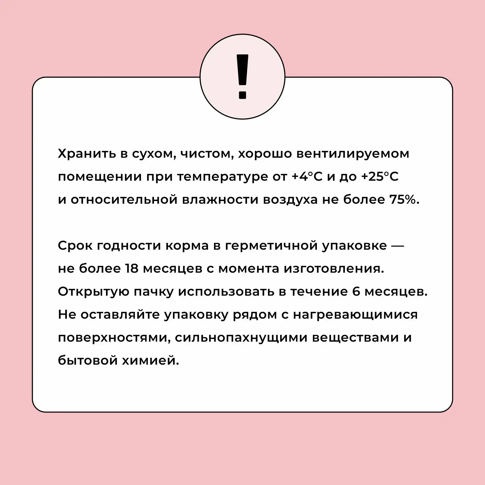 - Соответствует нормам по кормам FEDIAF, NRC и российскому ГОСТу Р 55453-2022.