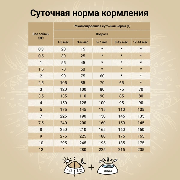| Вес собаки (кг) | Рекомендованная суточная норма (г) | ||||