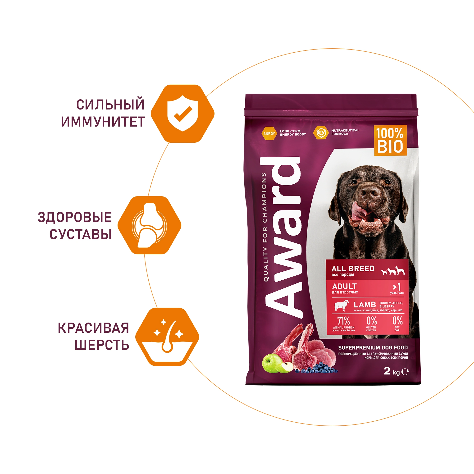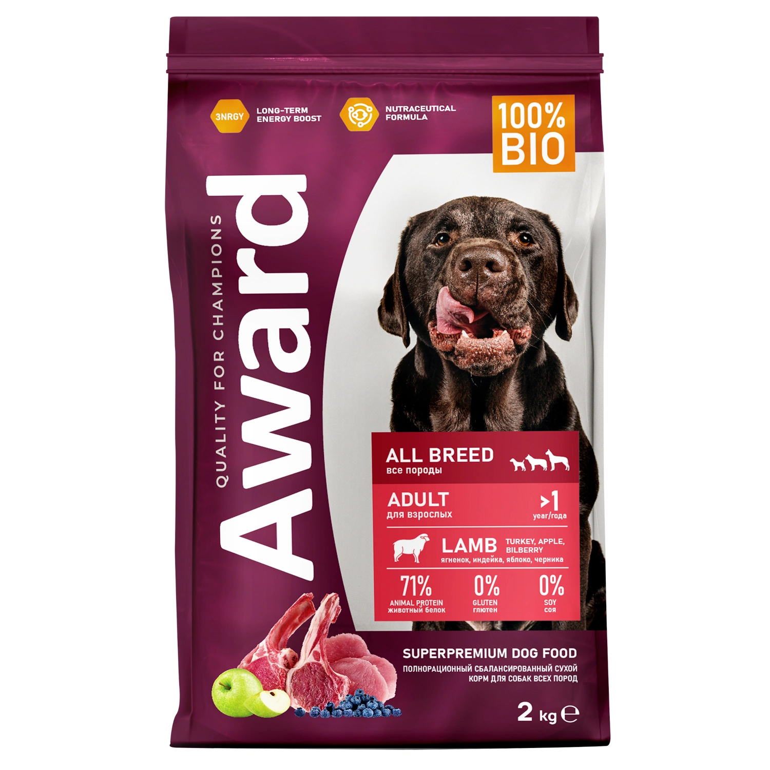 Сухой корм AWARD для взрослых собак всех пород с ягненком с индейкой с добавлением яблока и черники.