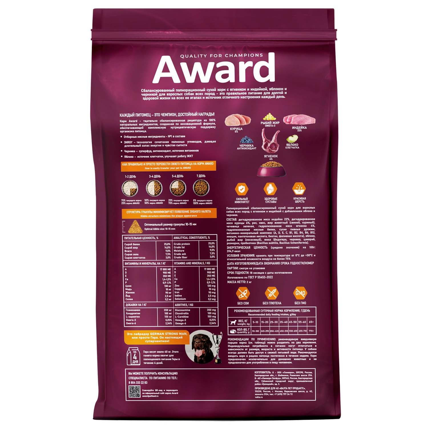 НОРМЫ КОРМЛЕНИЯ: Рекомендуемую ежедневную порцию корма (см. таблицу на упаковке или на сайте) можно разделить на два кормления. Индивидуальные потребности в питании могут отличаться в зависимости от размера, возраста и активности питомца. У собаки всегда должен быть доступ к свежей питьевой воде. Рекомендуется вводить корм в рацион питомца постепенно в течение недели. Корм предназначен исключительно для домашних животных и не предназначен для употребления в пищу человеком.