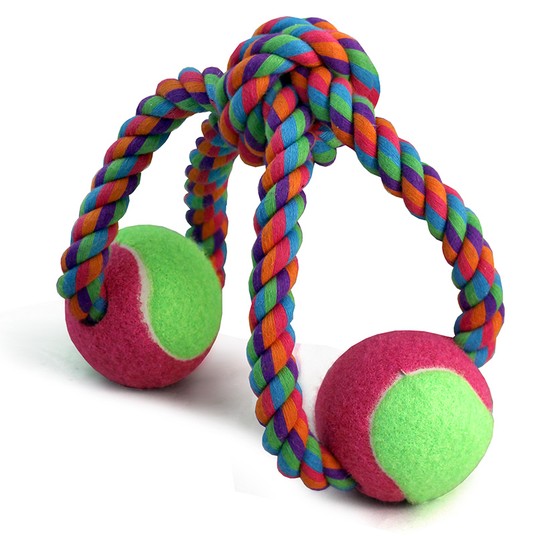 Веревка цветная с двумя мячами предназначена для тяговых игр с собаками крупных пород. Хорошо развивает челюсть собаки. Удобная ручка - противоскользящая. Игры с Вашим питомцем помогают поддерживать его в хорошей форме. Выполнена из 100% натуральных материалов.