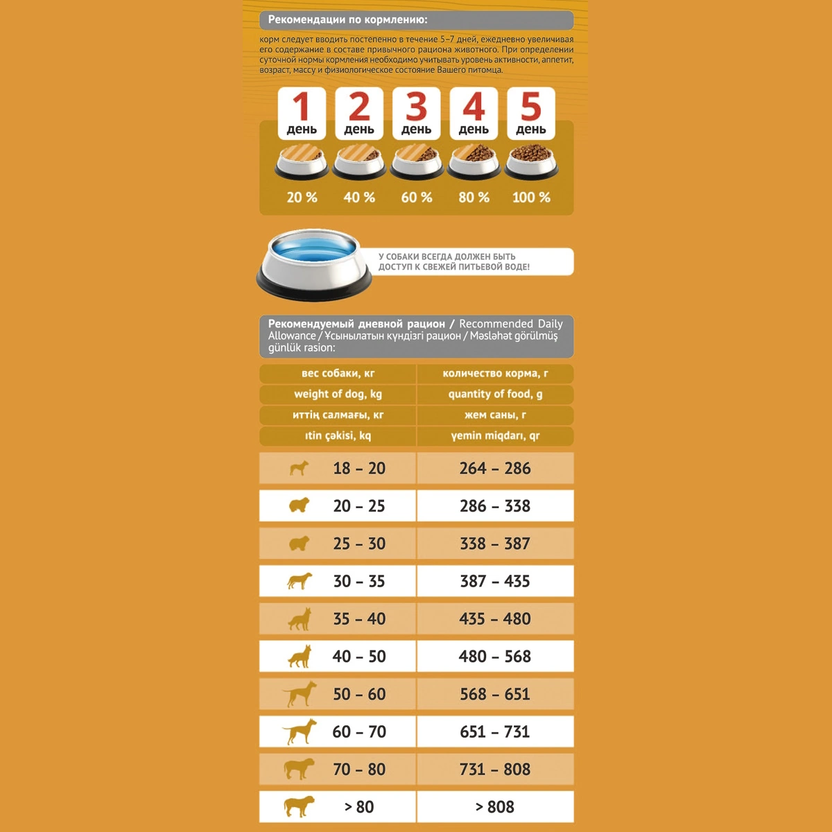 СОСТАВ: Дегидратированное мясо птицы (26%), рис, протеины растительного происхождения, ячмень, куриный жир, жом свекловичный, дрожжи (источник витаминов группы В), натуральная вкусоароматическая добавка, масло подсолнечное, льняное семя (источник Омега-3 и Омега-6 жирных кислот), витаминно-минеральная добавка для собак (витамины А, D3, Е, В1, В2, В3, В4, В5, В6, В9 (фолиевая кислота), В12, Н (биотин), железо, медь, цинк, марганец, йод, селен), яичный порошок, жир рыбий, фитокомпозиция (морская капуста (ламинария), шиповник, рябина красная, тыква, капуста белокочанная, клюква, укроп), экстракт Юкки Шидигера (снижает запах фекалий), глюкозамин, хондроитин (здоровая работа суставов), L-карнитин (способствует сжиганию жиров в организме). Добавки, сохраняющие продукт: микокарб, натуральные антиоксиданты (смесь токоферолов).