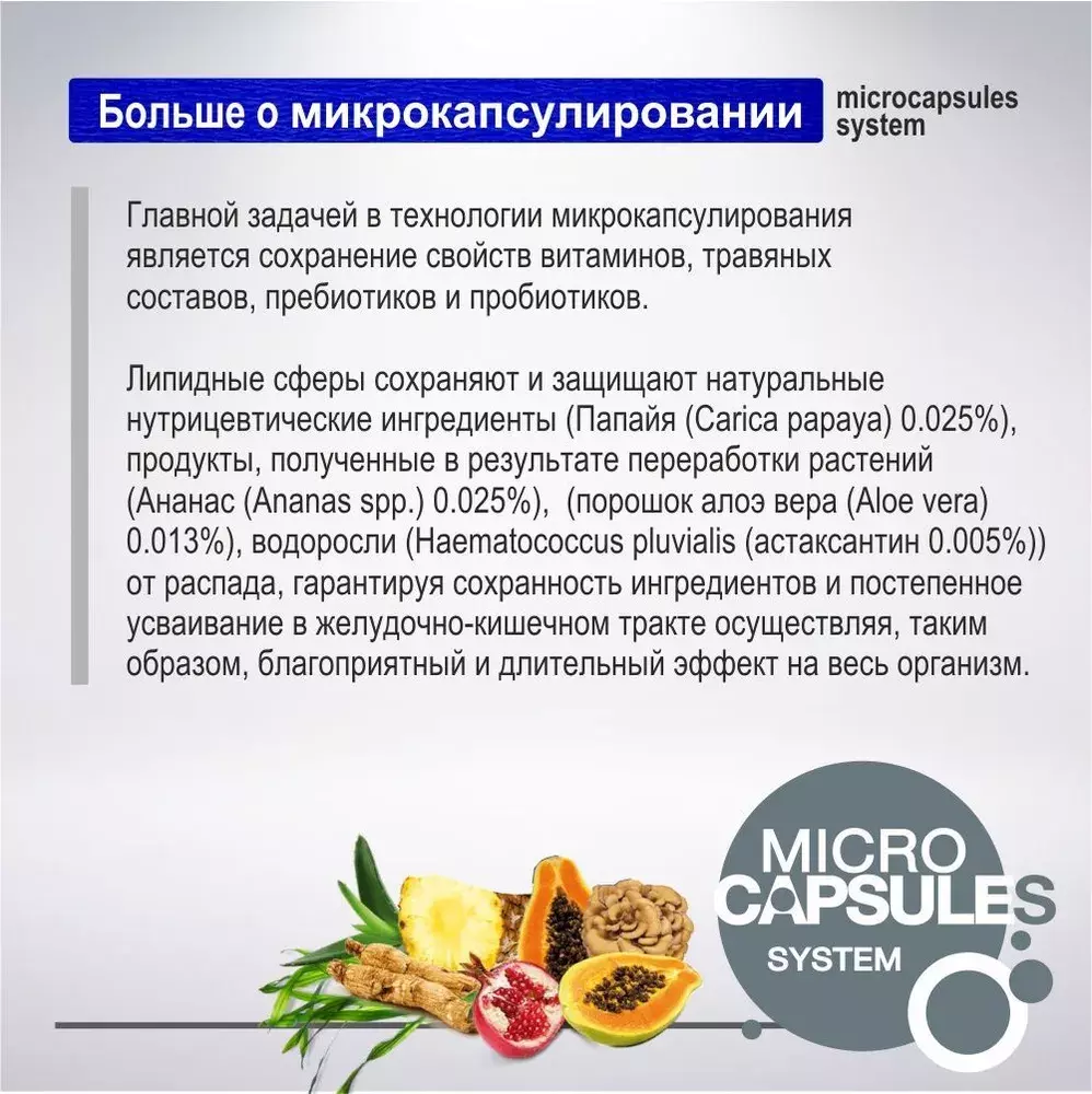 Небольшие липидные сферы сохраняют и защищают натуральные нутрицевтические ингредиенты (женьшень, ананас, папайя и гранат) от распада, гарантируя их сохранность и постепенное усваивание в желудочно-кишечном тракте осуществляя, таким образом, благоприятный и длительный эффект на весь организм.