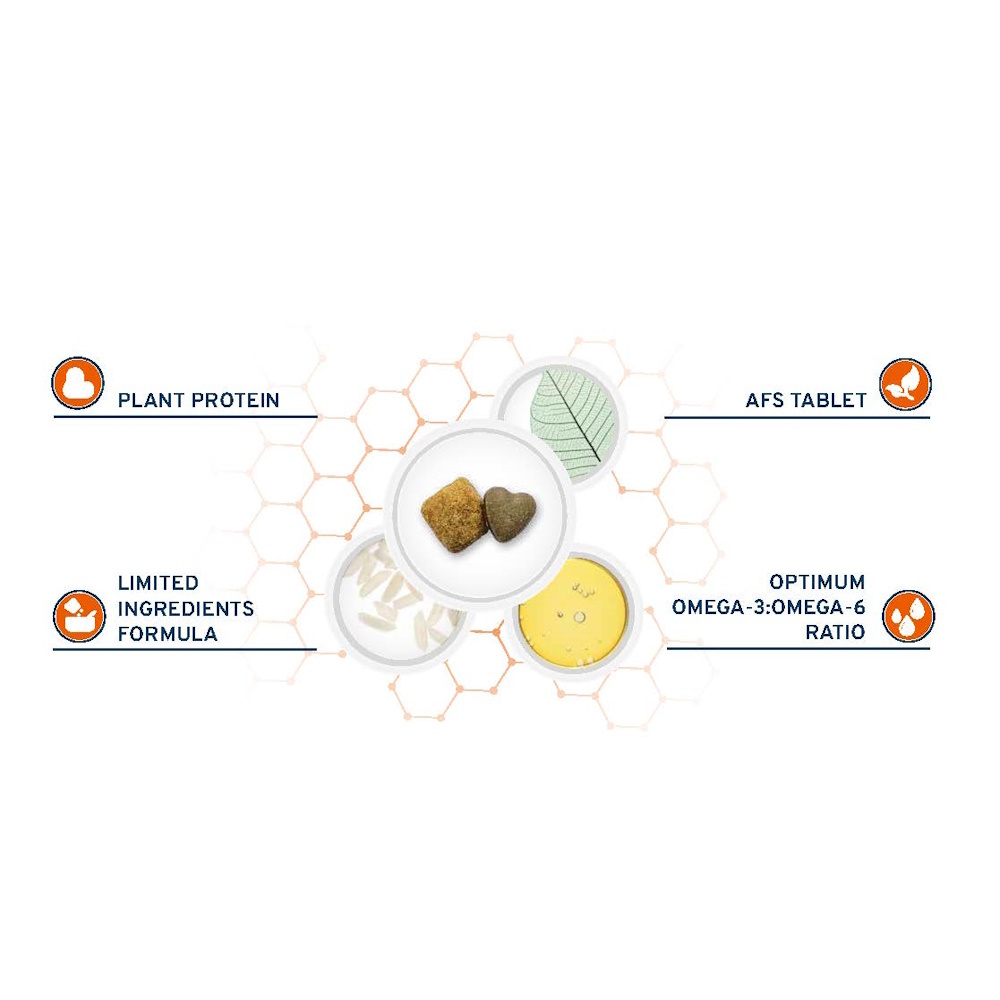 Ингредиенты: Молотый рис, гороховый крахмал, куриный жир, картофельный белок 10,4%, ((таблетка AFS – 7% от пищевого продукта): картофельный белок, минеральные вещества, гидролизованный животный белок 0,68%, пилоселла, продукты переработки трав (Lespedeza spp. 0,0593%), сухофруктовые выжимки (Vaccinium macrocarpon 0,0376%), листья толокнянки)), свекольный жом, рисовая прослойка, сушеные водоросли (Ascophyllum nodosum), рыбий жир 2% , сырое масло зародышей кукурузы, гидролизованный животный белок 2%, минеральные вещества, маннановые олигосахариды (MOS), фруктоолигосахариды (FOS), юкка шидигера.