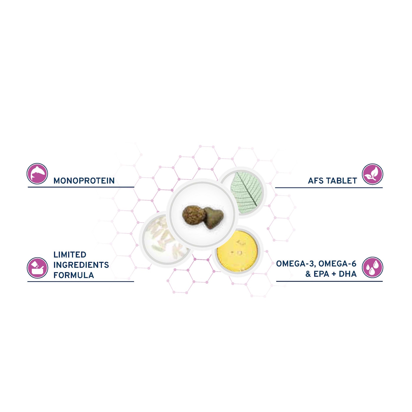 - Монопротеин: сформулирован с альтернативным единственным источником животного белка: рыбный белок с высокой биологической ценностью и биодоступностью.