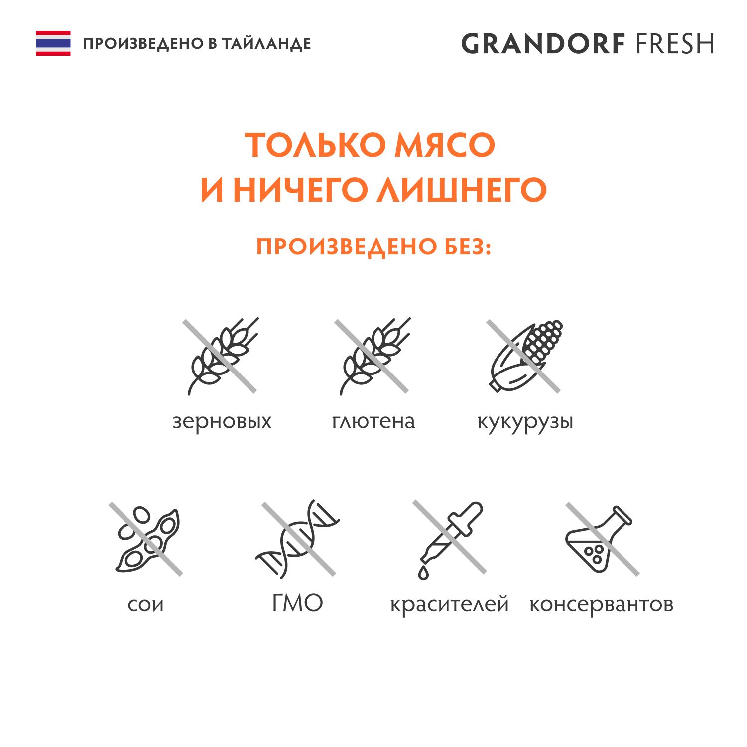 Все влажные корма GRANDORF FRESH основаны на мясе и содержат только высококачественные животные белки. Животный белок очень ценен и содержит все незаменимые аминокислоты для вашего питомца и полностью удовлетворит его биологические потребности в мясном питании.