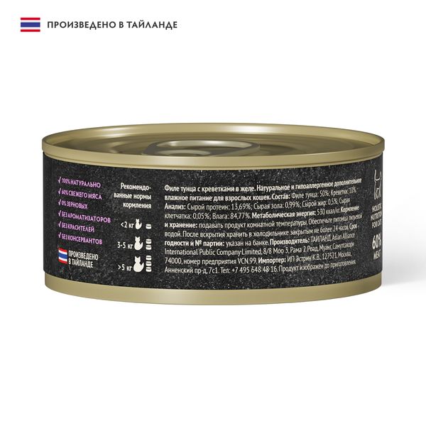 Состав: Филе тунца: 50%; Креветки: 10%.