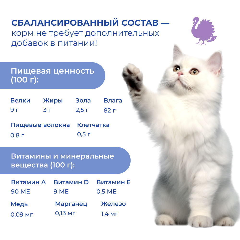 Состав: Мясо курицы, мясные и куриные субпродукты 40% (в т.ч. индейка не менее 4%), рыба, злаки, горох, растительная клетчатка, витамины и минеральные вещества, Омега-3 и Омега-6 жирные кислоты, таурин, пребиотик. Пищевая ценность (100 г): белки - 9 г, жиры - 3,0 г, зола - 2,5 г, клетчатка - 0,5 г, пищевые волокна - 0,8 г влага - 82 г.