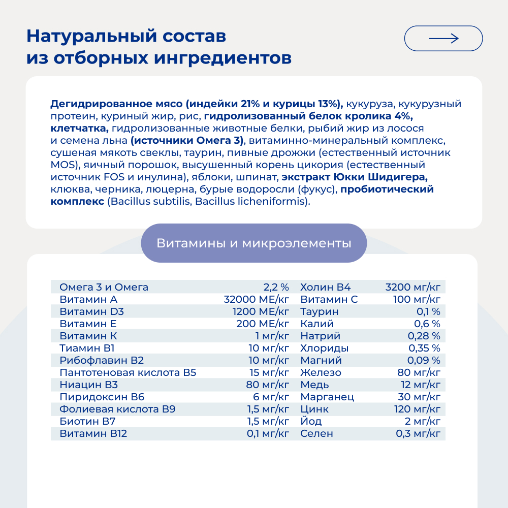 Состав: Дегидрированное мясо (индейки 21% и курицы 13%), кукуруза, кукурузный протеин, куриный жир, рис, гидролизованный белок кролика 4%, клетчатка, гидролизованные животные белки, рыбий жир из лосося и семена льна (источники Омега 3), витаминно-минеральный комплекс, сушеная мякоть свеклы, таурин, пивные дрожжи (естественный источник MOS), яичный порошок, высушенный корень цикория (естественный источник FOS и инулина), яблоки, шпинат, экстракт Юкки Шидигера, клюква, черника, люцерна, бурые водоросли (фукус), пробиотический комплекс (Bacillus subtilis, Bacillus licheniformis). Сохранено консервантами, антиоксидантами, в том числе натуральным токоферолом (витамином Е) и экстрактом розмарина.