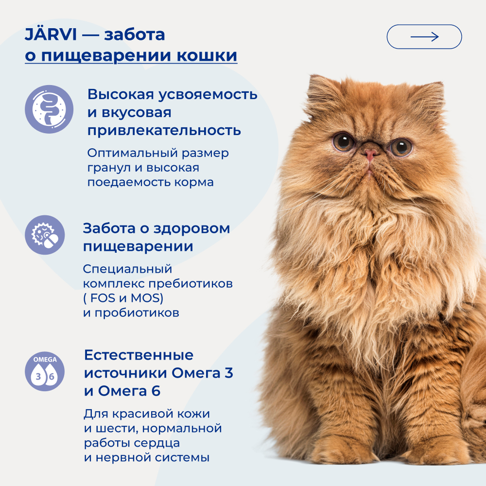 Сухой корм Jarvi для кошек – это холистический, полнорационный корм для сбалансированного питания. Он соответствует высоким стандартам финского качества, разработан нутрициологами и одобрен ветеринарами.