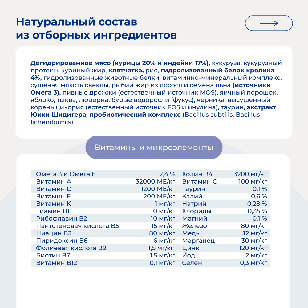 Состав: дегидрированное мясо (индейки 17% и курицы 21%), кукуруза, кукурузный протеин, животный жир (в том числе куриный), клетчатка, рис, гидролизованные животные белки, рыбий жир из лосося и семена льна (источники омега 3), витаминно-минеральный комплекс, пивные дрожжи (естественный источник MOS), яичный порошок, сушеная мякоть свеклы, таурин, яблоки, тыква, высушенный корень цикория (естественный источник FOS и инулина), экстракт Юкки Шидигера, черника, люцерна, бурые водоросли (фукус), пробиотический комплекс (Bacillus subtilis, Bacillus licheniformis). Сохранено консервантами, антиоксидантами, в том числе натуральным токоферолом (витамином Е) и экстрактом розмарина.