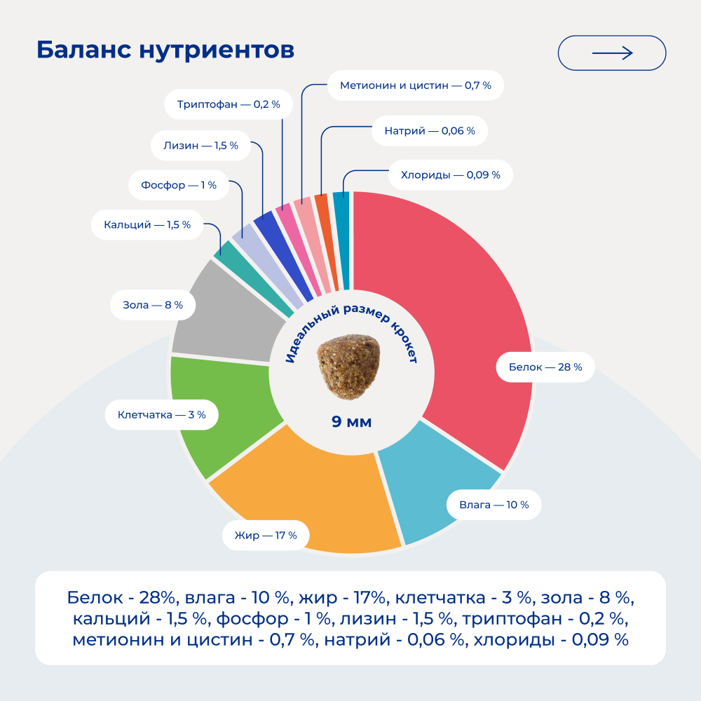 В составе корма присутствуют все необходимые витамины и микроэлементы для полноценного развития и здоровья вашего питомца. Естественные источники FOS, MOS и пробиотичесий комплекс обеспечивают хорошую усвояемость. Линейка кормов включает в себя несколько видов продуктов, которые можно подобрать под индивидуальные особенности вашего домашнего животного.
