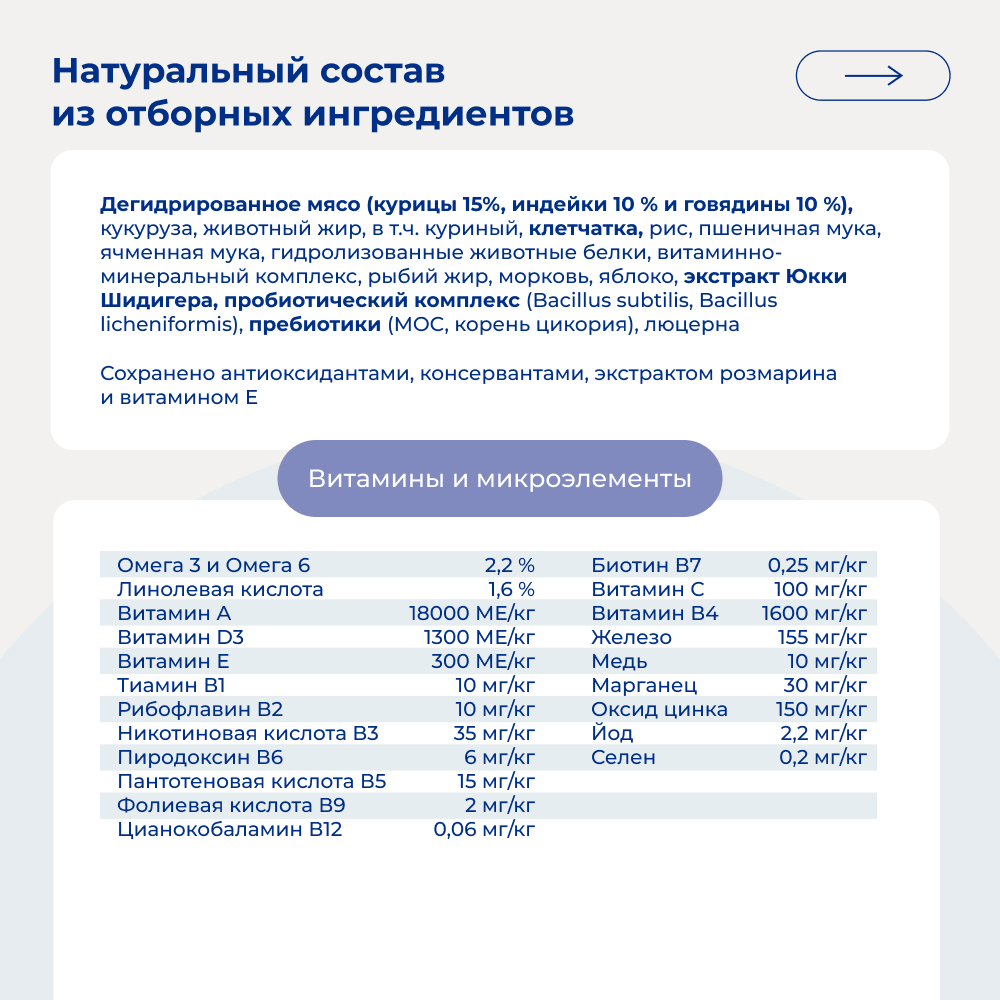 Состав: дегидрированное мясо (курицы 15%, индейки 10 % и говядины 10 %), кукуруза, животный жир, в т.ч. куриный, клетчатка, рис, пшеничная мука, ячменная мука, гидролизованные животные белки, витаминно-минеральный комплекс, рыбий жир, морковь, яблоко, экстракт Юкки Шидигера, пробиотический комплекс (Bacillus subtilis, Bacillus licheniformis), пребиотики (MOC, корень цикория), люцерна. Сохранено антиоксидантами, консервантами, экстрактом розмарина и витамином Е.
