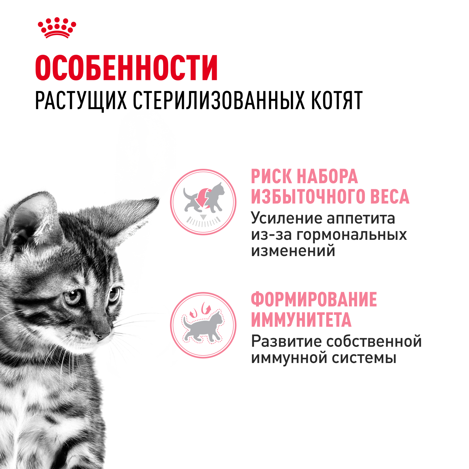 Киттен стерилайзд: влажный корм для стерилизованных котят в возрасте от 6 до 12 месяцев. Уже через 48 часов после стерилизации у кошки может существенно возрасти аппетит, что приведет к набору избыточного веса. Умеренная калорийность продукта Киттен стерилайзд позволяет избежать набора избыточного веса, а оптимальное количество белков и минеральных веществ поддерживает здоровый рост котенка.