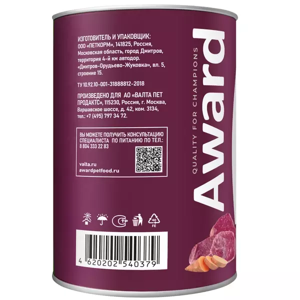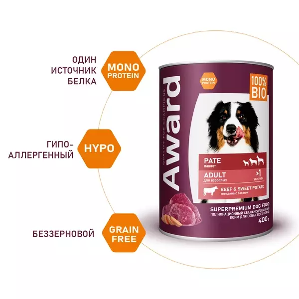 Консервы AWARD для взрослых собак, паштет из говядины с бататом