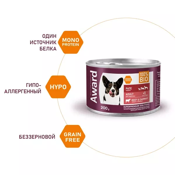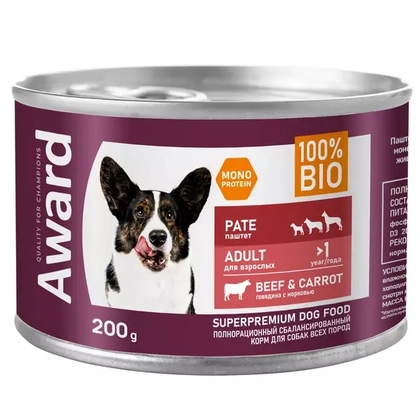 Консервы AWARD для взрослых собак, паштет из говядины с морковью, 200 г — купить в Zoogastronom с доставкой по Самаре, Тольятти и России