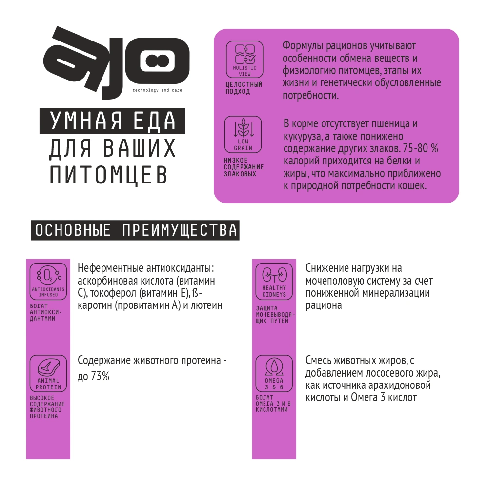 Для правильного питания кошек и поддержания здоровья питомцев необходимо полезное и качественное питание, а также особые сочетания высококачественных животных жиров для повышения вкусовой привлекательности. Поэтому сухой корм AJO (Айо) разработан с учетом всех этих особенностей, содержит все необходимые питательные вещества.