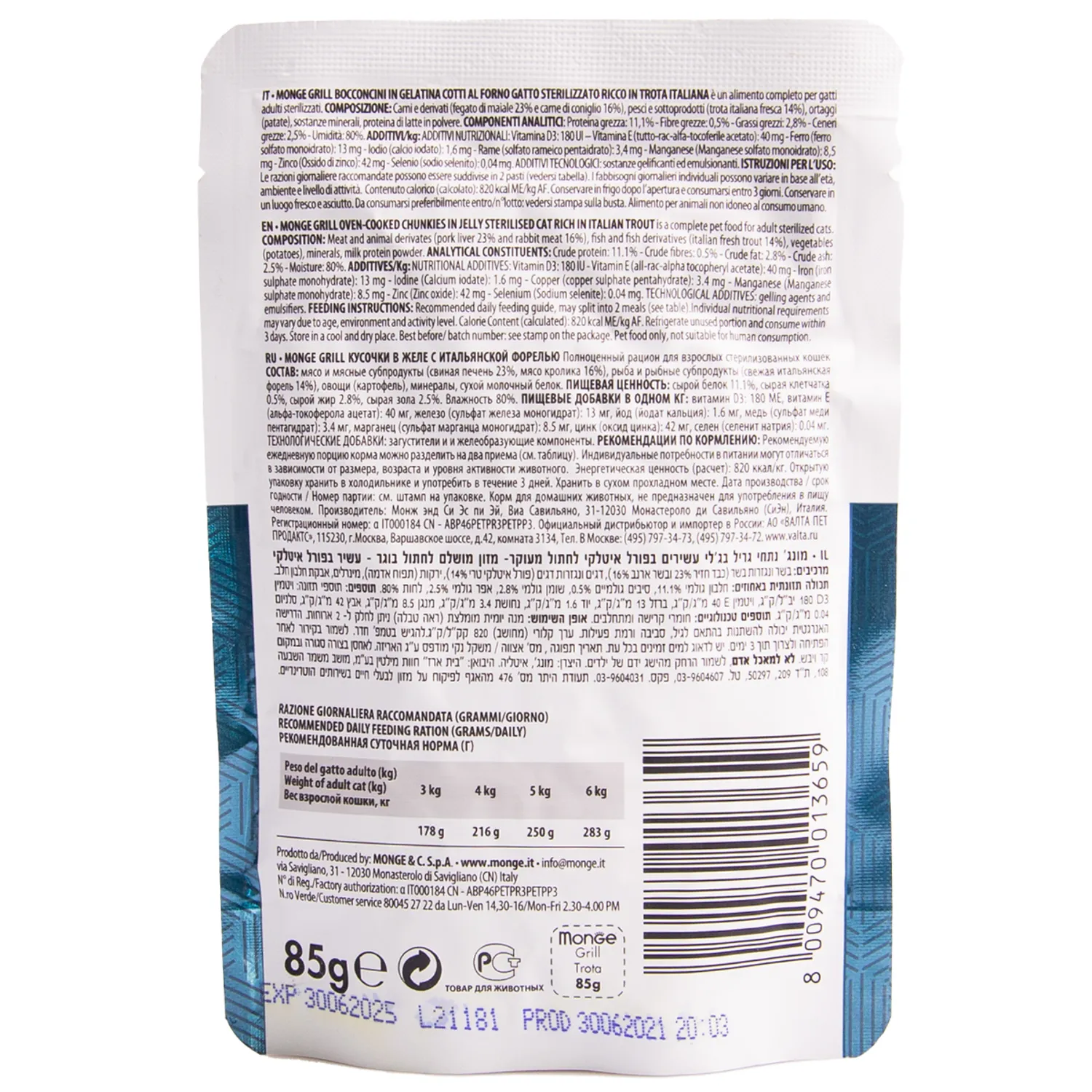 Monge (Монж) Cat Grill полнорационные беззерновые паучи с итальянской форелью для стерилизованных кошек и кастрированных котов.
