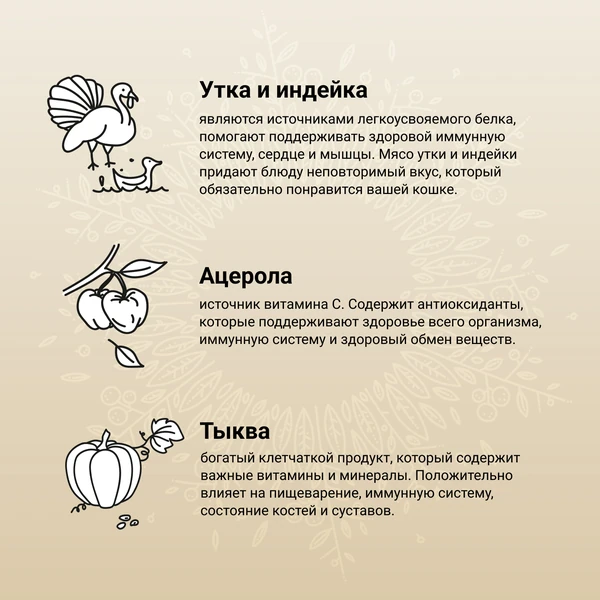 Основные источники белка в корме — свежее мясо утки и индейки. Комбинация этих белков легко переваривается, помогает поддерживать оптимальный вес питомца, стабилизирует обмен веществ. Утка и индейка — отличные источники незаменимых аминокислот, витаминов и минералов. Исключен распространенный аллерген — курица.