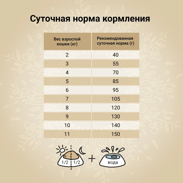 Питательные добавки на 1 кг: витамин А – 18000ME; витамин D3 – 1800ME; витамин Е – 215мг; витамин С – 180мг; ниацинамид - 54мг; D-пантенол - 22,5мг; витамин B2 - 11,25мг; витамин B6 - 6мг; витамин B1 - 11,25мг; биотин - 0,54мг; фолиевая кислота - 0,54мг; витамин B12 - 0,09мг; холина хлорид - 2700мг; Цинк (Хелат цинка гидрата глицина) - 79,90 мг; Марганец (Хелат марганца гидрата глицина) - 17,00мг; Железо [Хелат железа (II) гидрата глицина] - 61,20мг; Медь [Хелат меди (II) гидрата глицина] - 11,90мг; Йод (безводный йодат кальция) - 1,70мг; Cелен (L-селенометионин) - 0,29мг; DL-метионин, технически чистый - 3000мг; Tаурин 1980 мг. Антиоксиданты: экстракт токоферолов натурального происхождения.