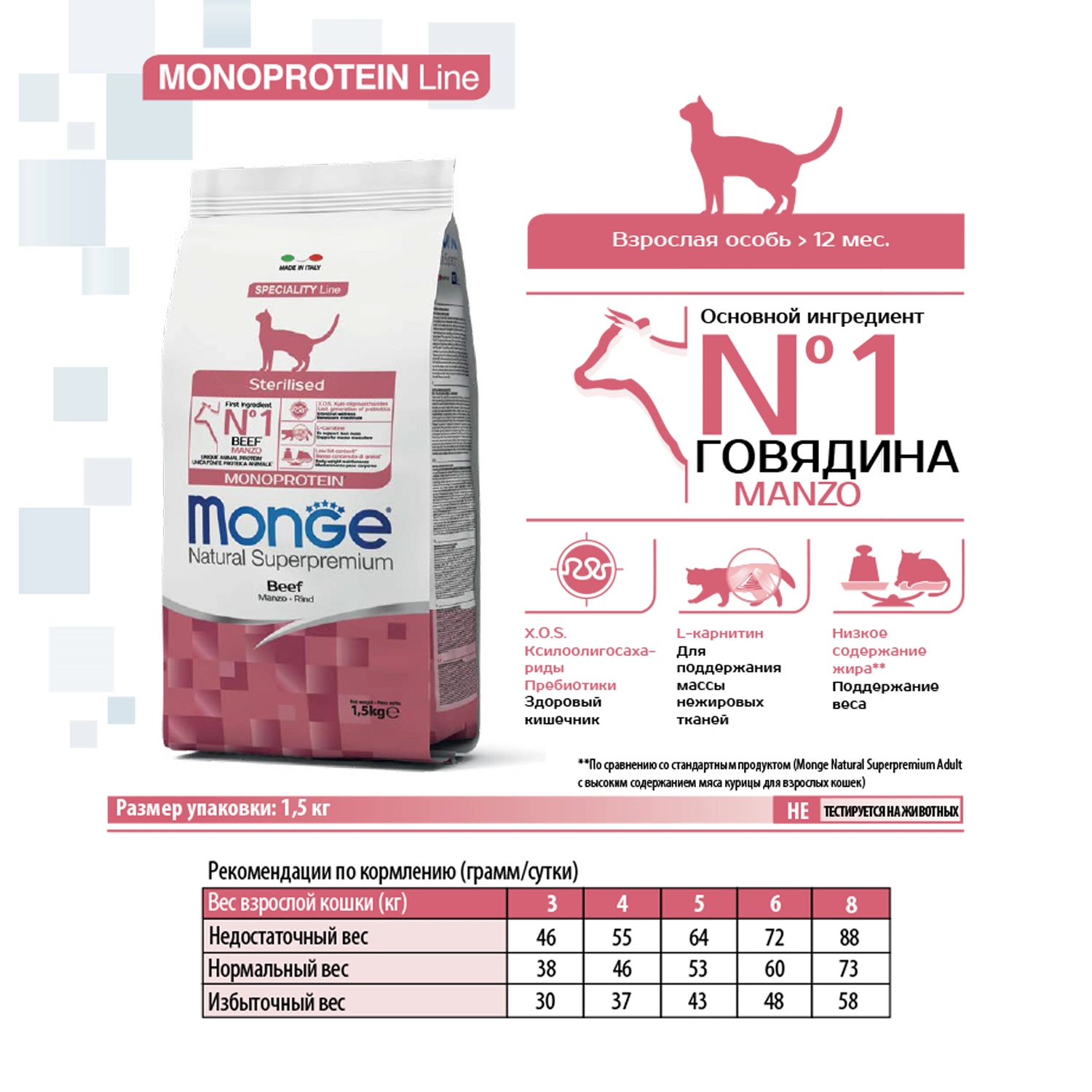 Сухой корм Monge Cat Speciality Line Monoprotein Sterilised для стерилизованных кошек, из говядины