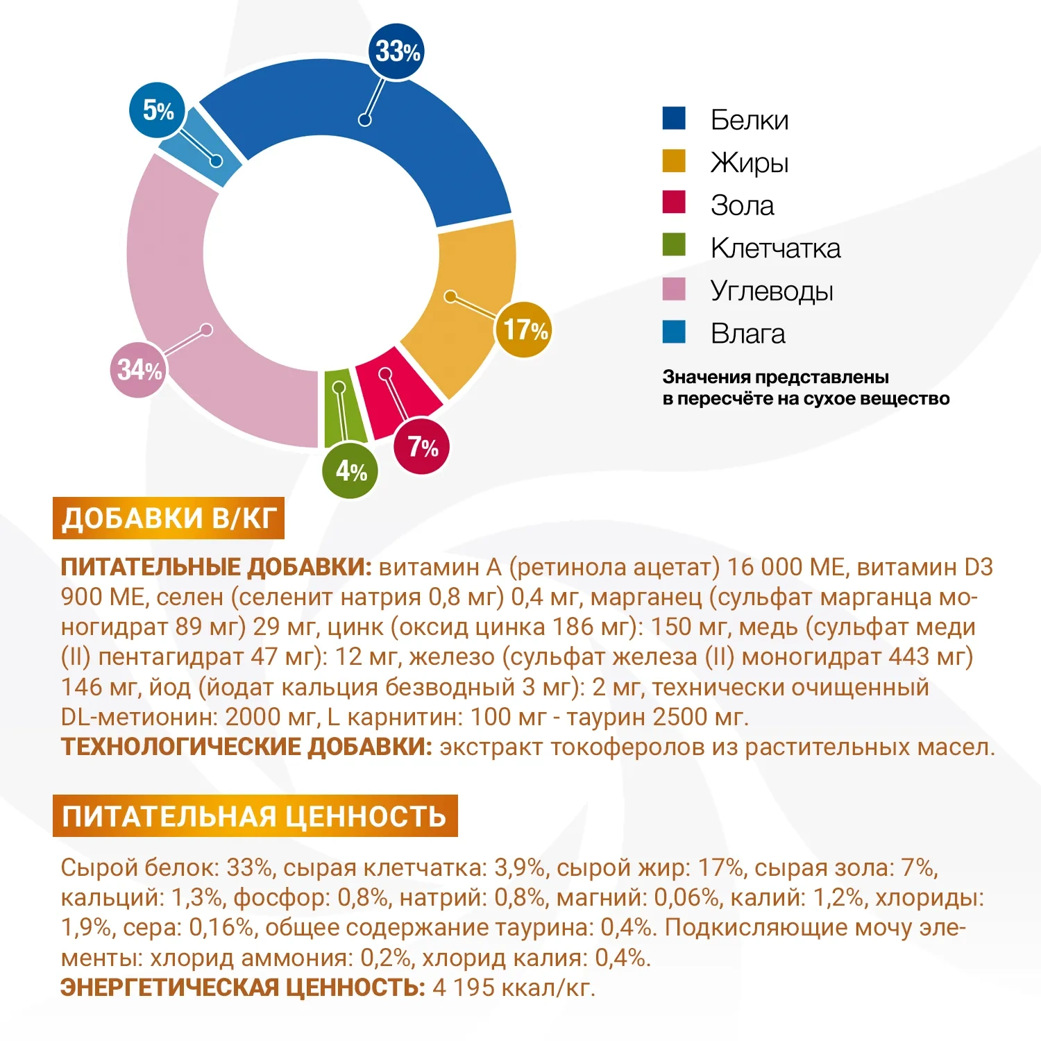 Подкисляющие мочу элементы: хлорид аммония: 0,2%, хлорид калия: 0,4%.