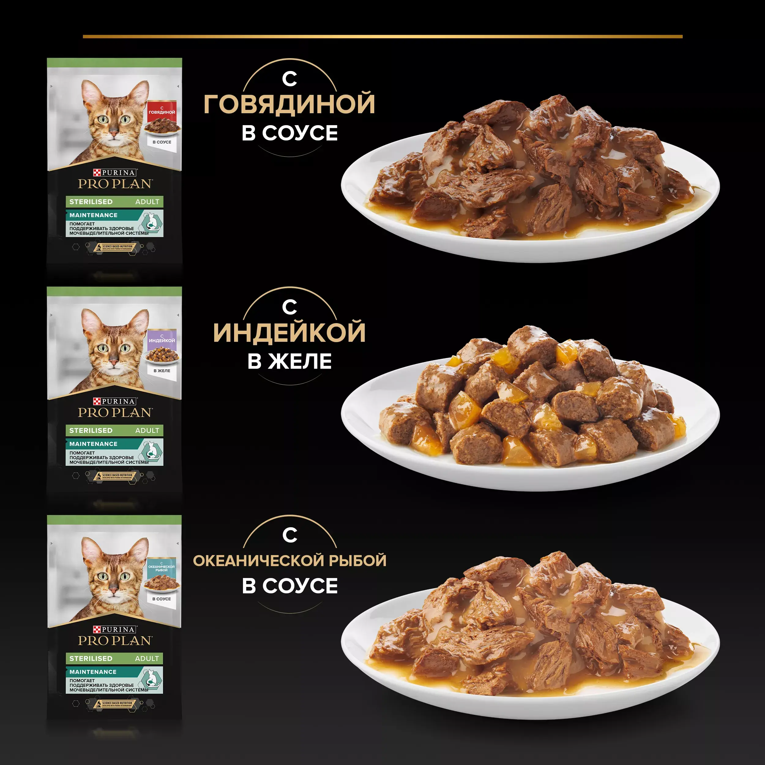 Влажный корм Pro Plan Sterilised Maintenance для взрослых стерилизованных кошек с говядиной в соусе, с индейкой в желе, с океанической рыбой в соусе 85 г х 10 шт.