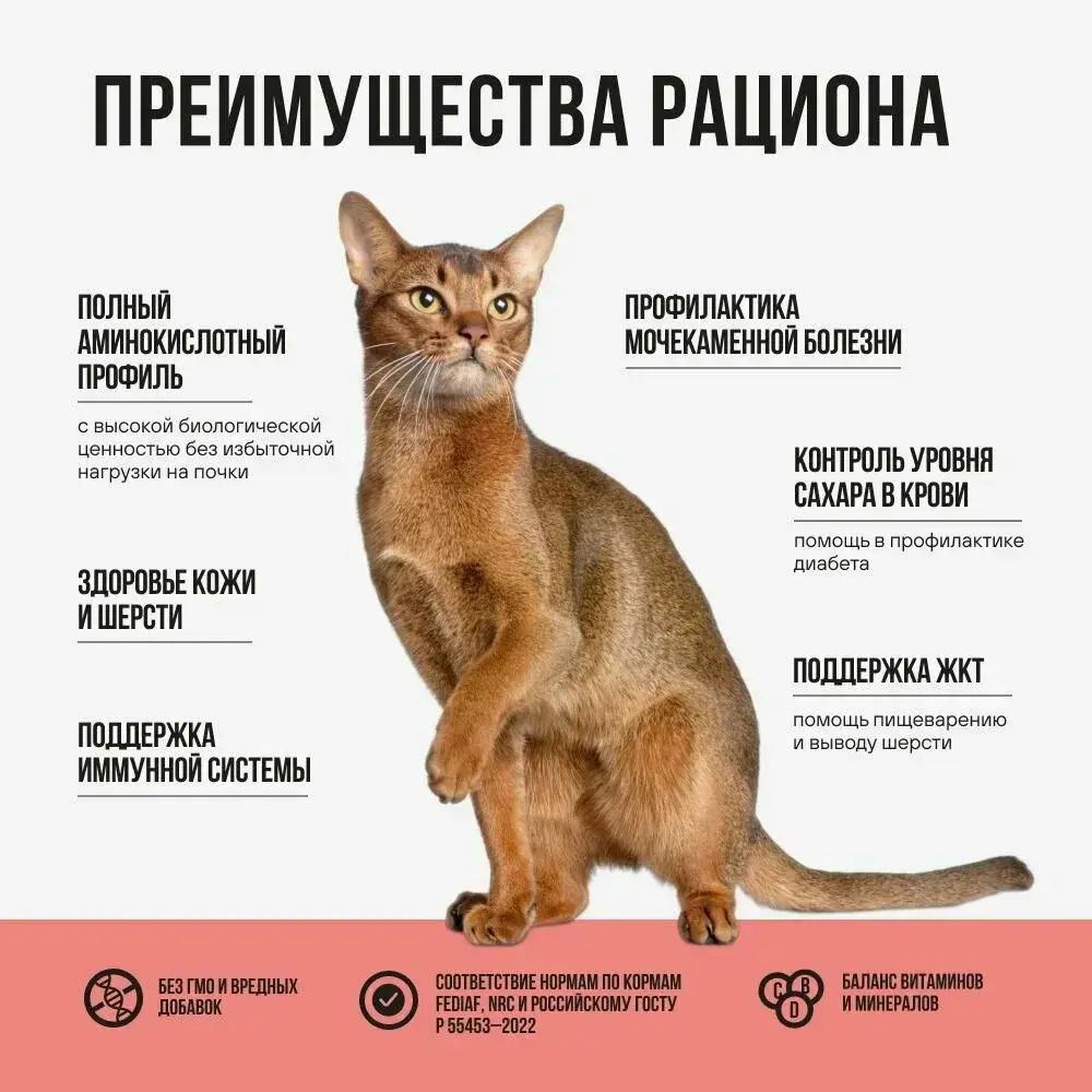 - Соответствует нормам по кормам FEDIAF, NRC и российскому ГОСТу Р 55453-2022.