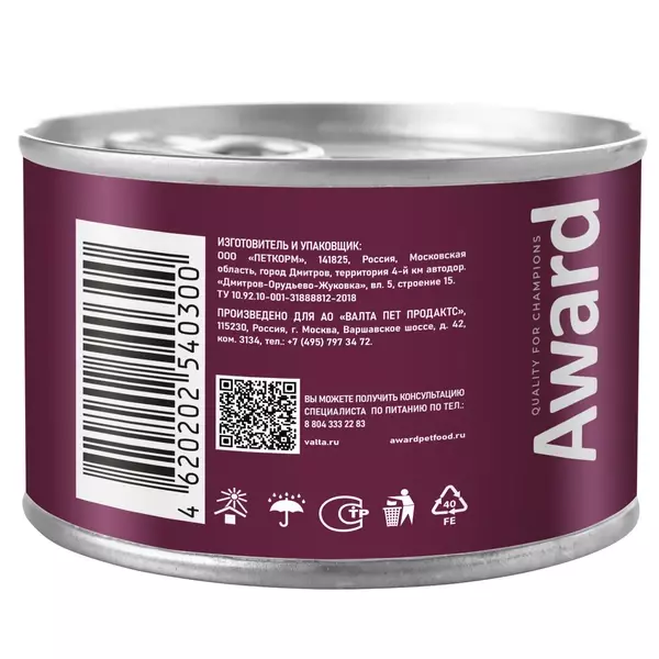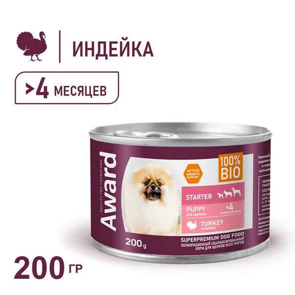 Консервы AWARD для щенков с начала прикорма до 4 месяцев, беременных и кормящих сук, паштет из индейки
