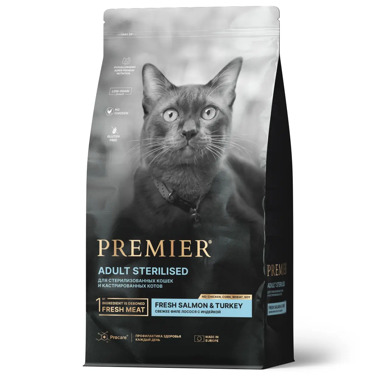 Уценка! Срок 04.05.26/ Сухой корм Premier Cat Salmon&Turkey Sterilised для стерилизованных кошек из свежего филе лосося с индейкой