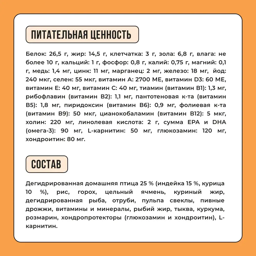 Питательная ценность на 100 г: белок: 28 г, жир: 13,8 г, клетчатка: 5 г, зола: 5,2 г, влага: не более 10 г, кальций: 1,3 г, фосфор: 1 г, калий: 0,72 г, магний: 0,1 г, медь: 1,5 мг, цинк: 12 мг, марганец: 5 мг, железо: 20 мг, йод: 243 мкг, селен: 60 мкг, витамин А: 1780 МЕ, витамин D3: 80 МЕ, витамин Е: 58 мг, витамин С: 61 мг, тиамин (витамин В1): 1,7 мг, рибофлавин (витамин В2): 1,4 мг, пантотеновая к-та (витамин В5): 2 мг, пиридоксин (витамин В6): 1,1 мг, фолиевая к-та (витамин В9): 50,5 мкг, цианокобаламин (витамин В12): 5,5 мкг, холин: 236 мг, омега-3 жирные кислоты: 0,5 %, омега-6 жирные кислоты: 3,7 %, L-карнитин: 50 мг, глюкозамин: 120 мг, хондроитин: 80 мг.